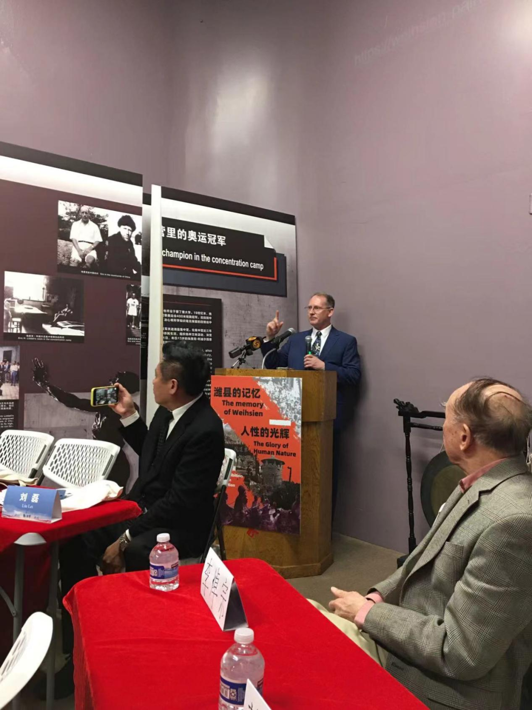 山东省外事办公室副主任、山东省友协常务副会长陈白薇,中国驻旧金山总领馆政治新闻处处长罗爽,美国联合市副市长JeffWang,潍县西方侨民集中营被关押侨民后代、美国宾夕法尼亚州库兹敦大学教授约翰·斯坦利,第十届中国侨联海外委员、山东省商会代表刘磊及当地华人华侨代表、美国当地观众200余人出席展览开幕式。乐道院潍县集中营博物馆副馆长李师庆介绍潍县西方侨民集中营旧址和本次海外巡展基本情况。