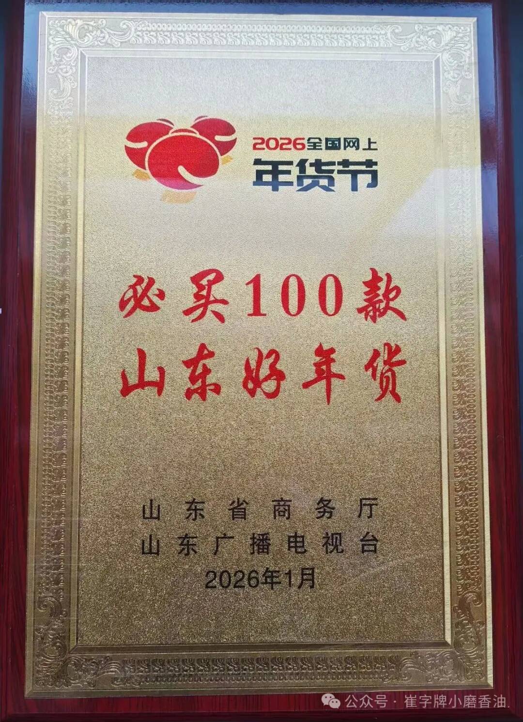 2月1日,“齐鲁有年味 云端买好品”2026网上年货节启动仪式在泰安成功举办。本次活动由山东省商务厅、山东省文化和旅游厅、山东省市场监督管理局、山东广播电视台、泰安市人民政府共同主办。活动现场对2026“必买100款山东好年货”榜单进行了发布,崔字牌小磨香油成功入选,这既是对崔字牌小磨香油高端品质的肯定,也为崔字牌小磨香油作为年货好礼走向更多家庭搭建了桥梁。