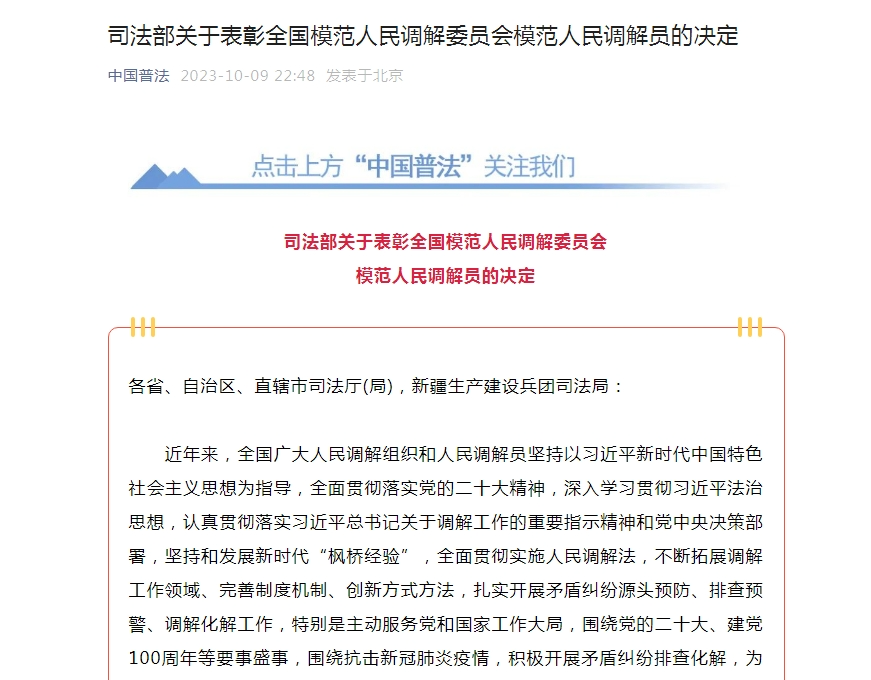 近日,司法部表彰了一批全国模范人民调解委员会和模范人民调解员,奎文区东关街道中学街社区人民调解委员会主任吕永芬荣获“全国模范人民调解员”称号。