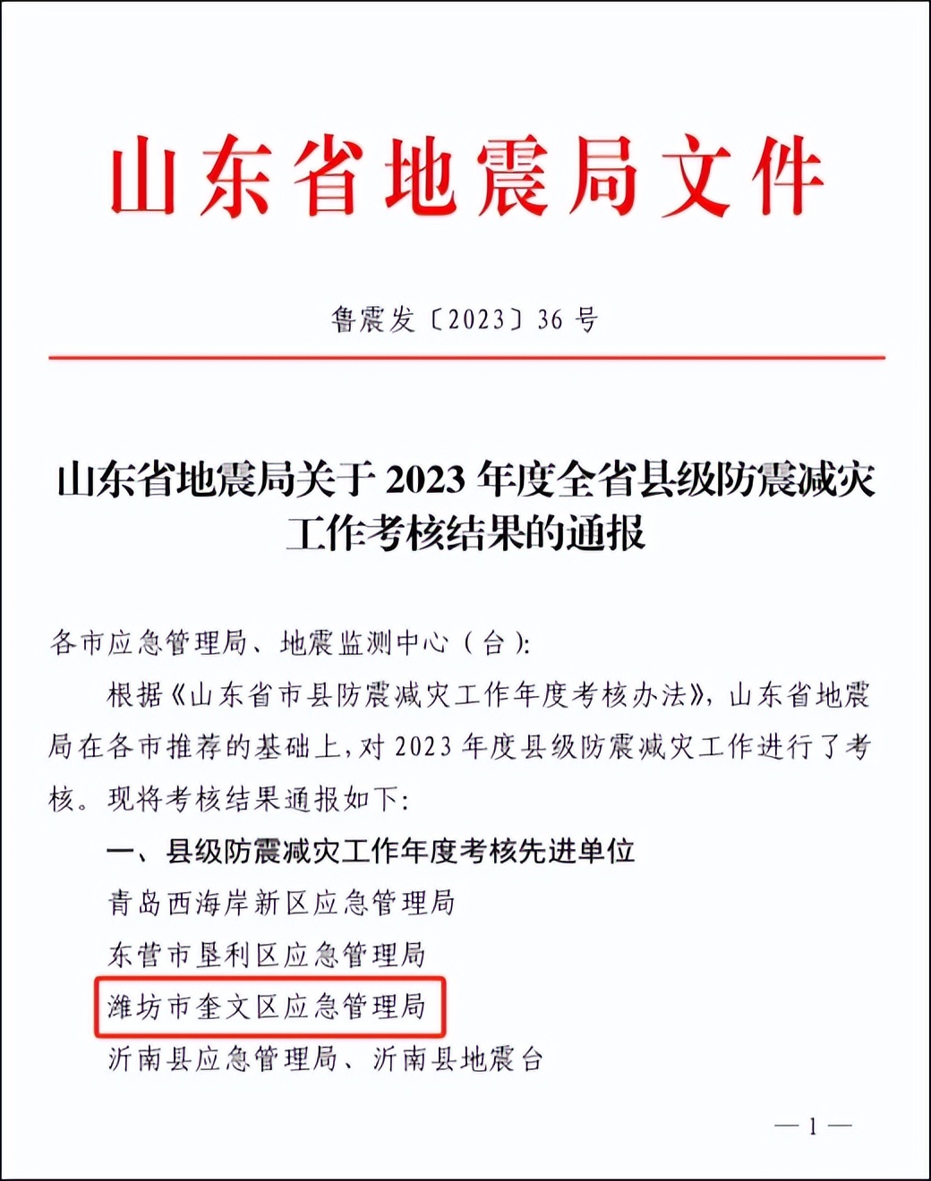 潍坊广电新媒体讯 近日,在山东省2023年度县级防震减灾工作考核中,潍坊市奎文区应急管理局获评“2023年度全省县级防震减灾工作考核先进单位”。