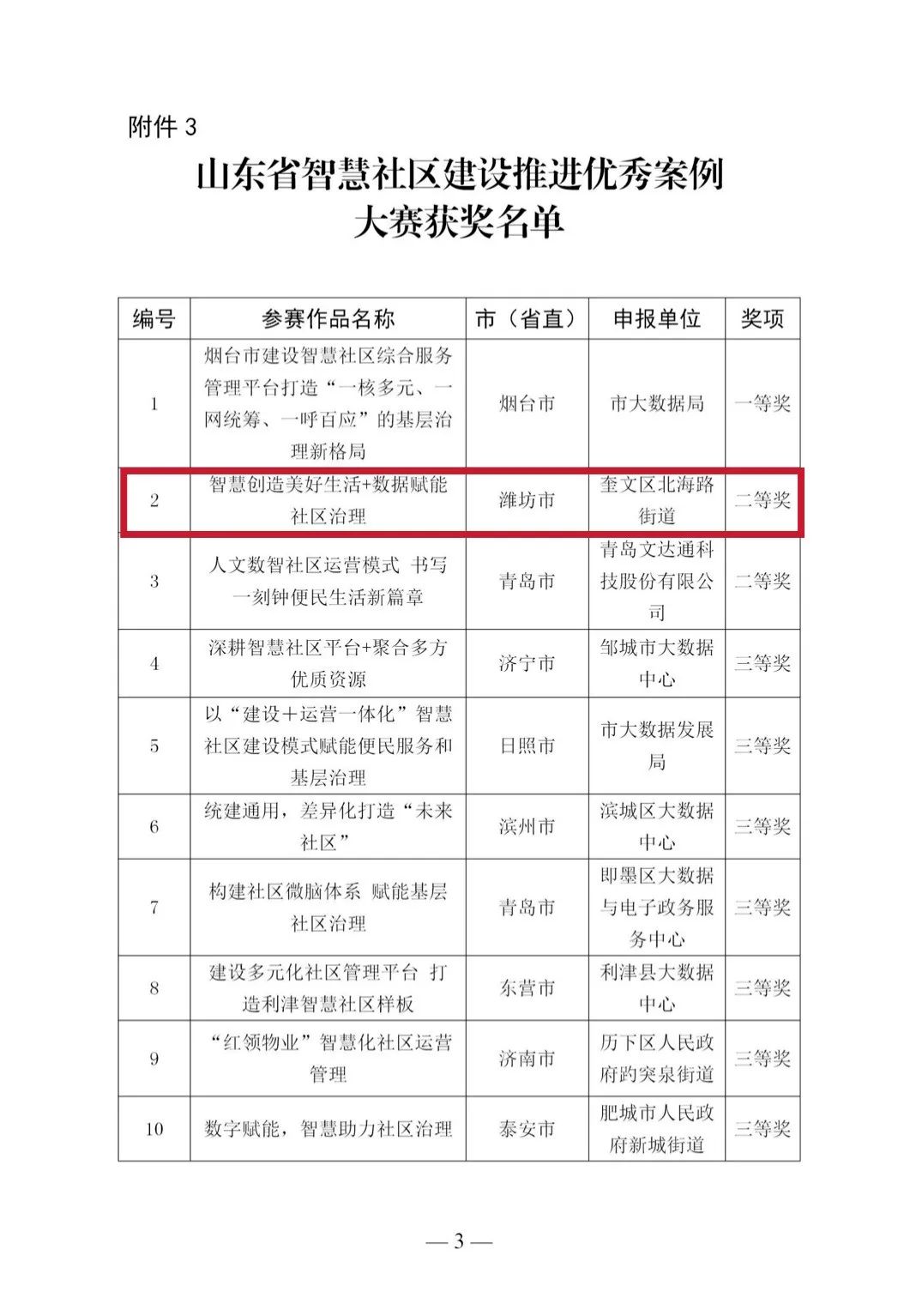 活动开展以来,受到各省直、市直有关单位、企业、科研院所等广泛关注和积极响应。从省直有关部门、各市报送的优秀案例以及峰会百佳案例中,遴选具有较强代表性、创新性和引领性的案例推荐到大赛,经专家进行多轮评选和审议,各赛道分别评选出一等奖1名、二等奖2名、三等奖7名。其中,北海路街道上报的“智慧创造美好生活,数据赋能社区治理”荣获山东省智慧社区建设推进优秀案例大赛二等奖。