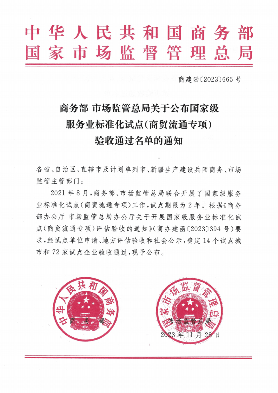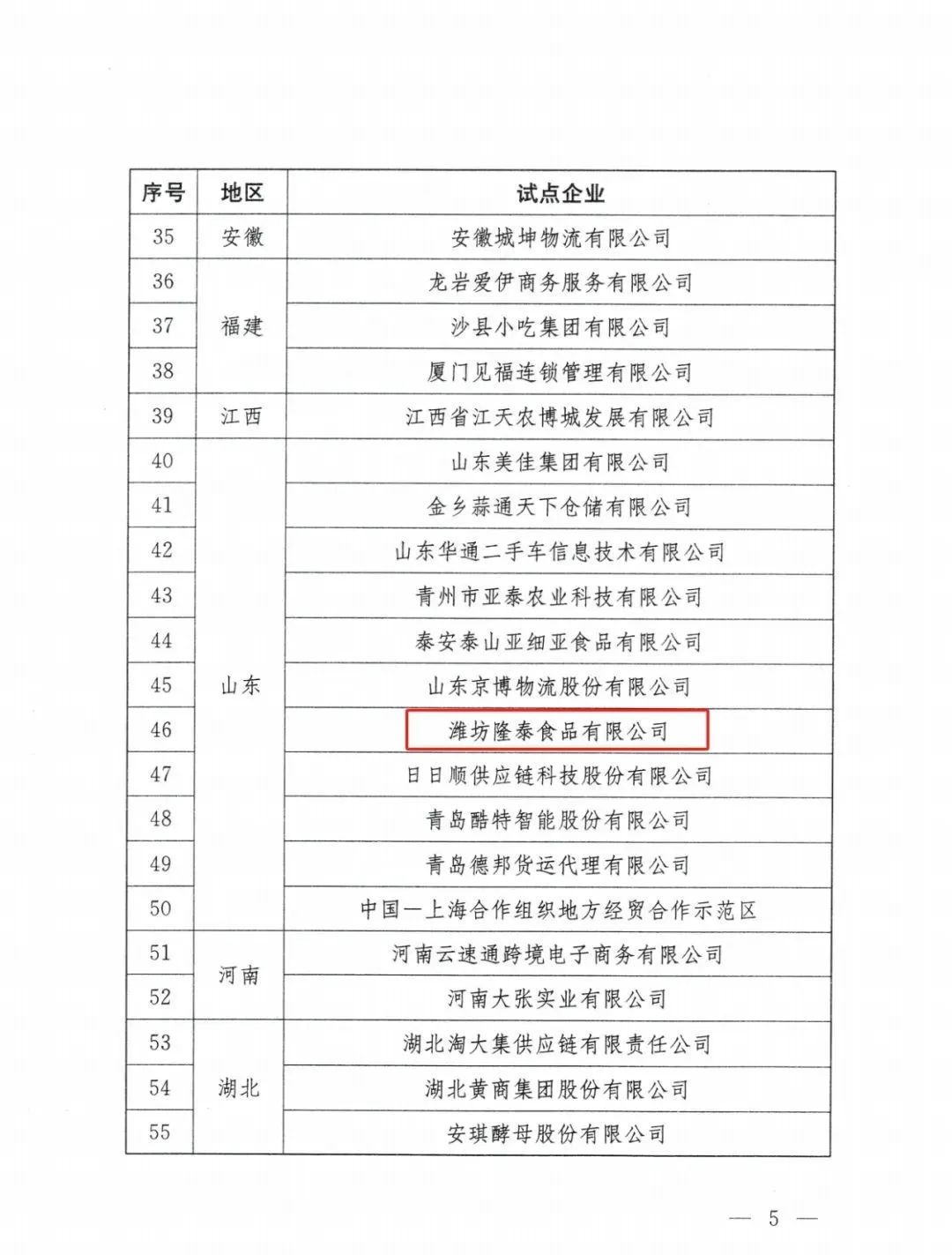 潍坊广电新媒体讯 近日,商务部、市场监管总局公布了国家级服务业标准化试点(商贸流通专项)验收通过名单,经试点单位申请、地方评估验收和社会公示,全国共有14个试点城市、72家企业试点企业通过验收。山东省共11家企业通过验收,其中,潍城区隆泰食品有限公司顺利通过验收,被确定为国家级服务业标准化试点单位。