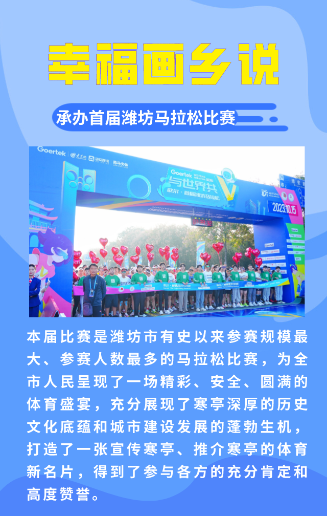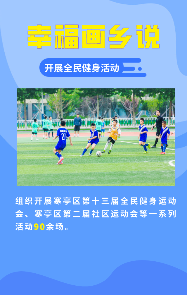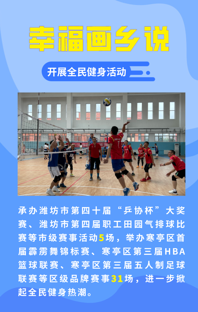 为深入贯彻实施全民健身国家战略,满足人民群众日益增长的健身需求。近年来,寒亭区不断加大体育事业资金投入,积极构建更高水平的全民健身公共服务体系,更新配建公共体育设施,开展丰富多彩的体育赛事,群众体育得到了前所未有的发展,全民健身意识明显增强,为体育事业注入了蓬勃动力。