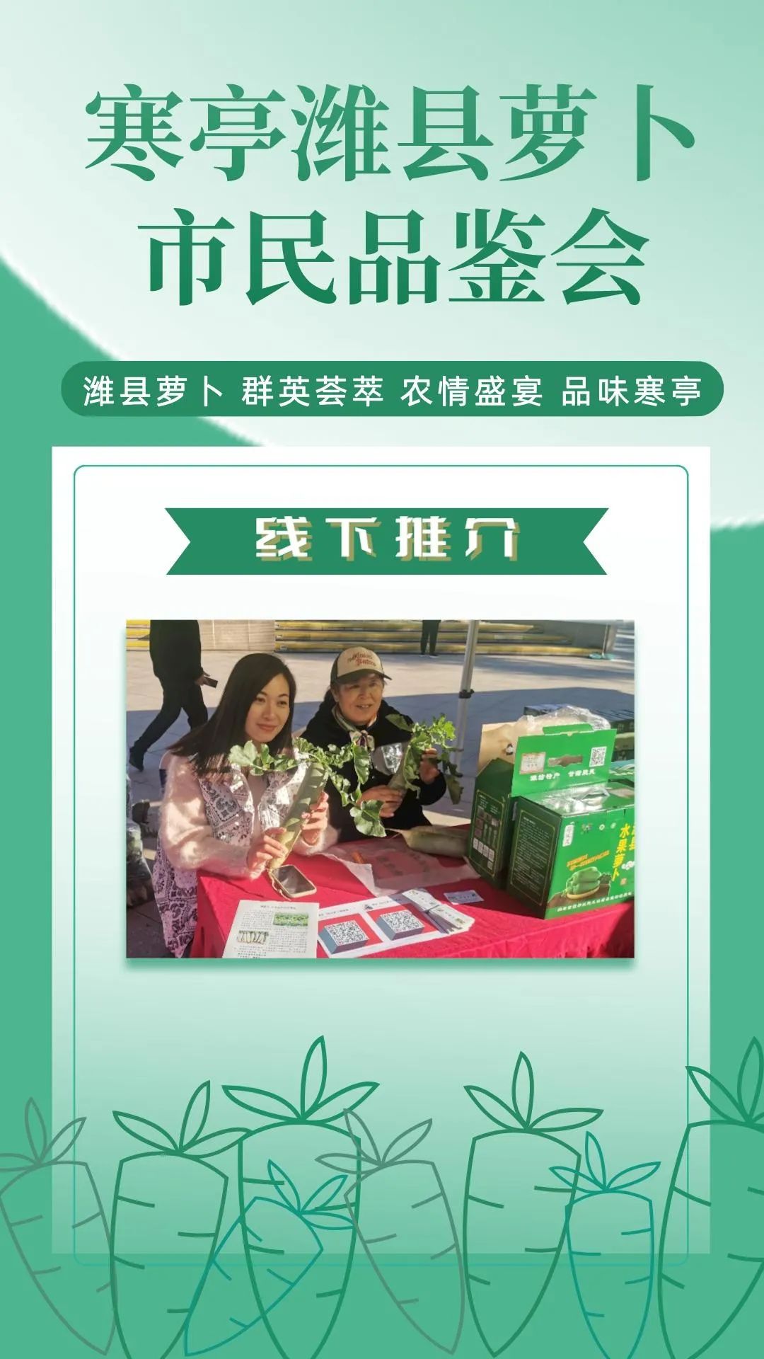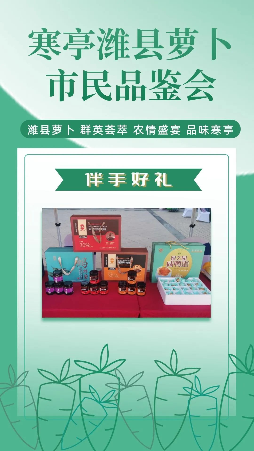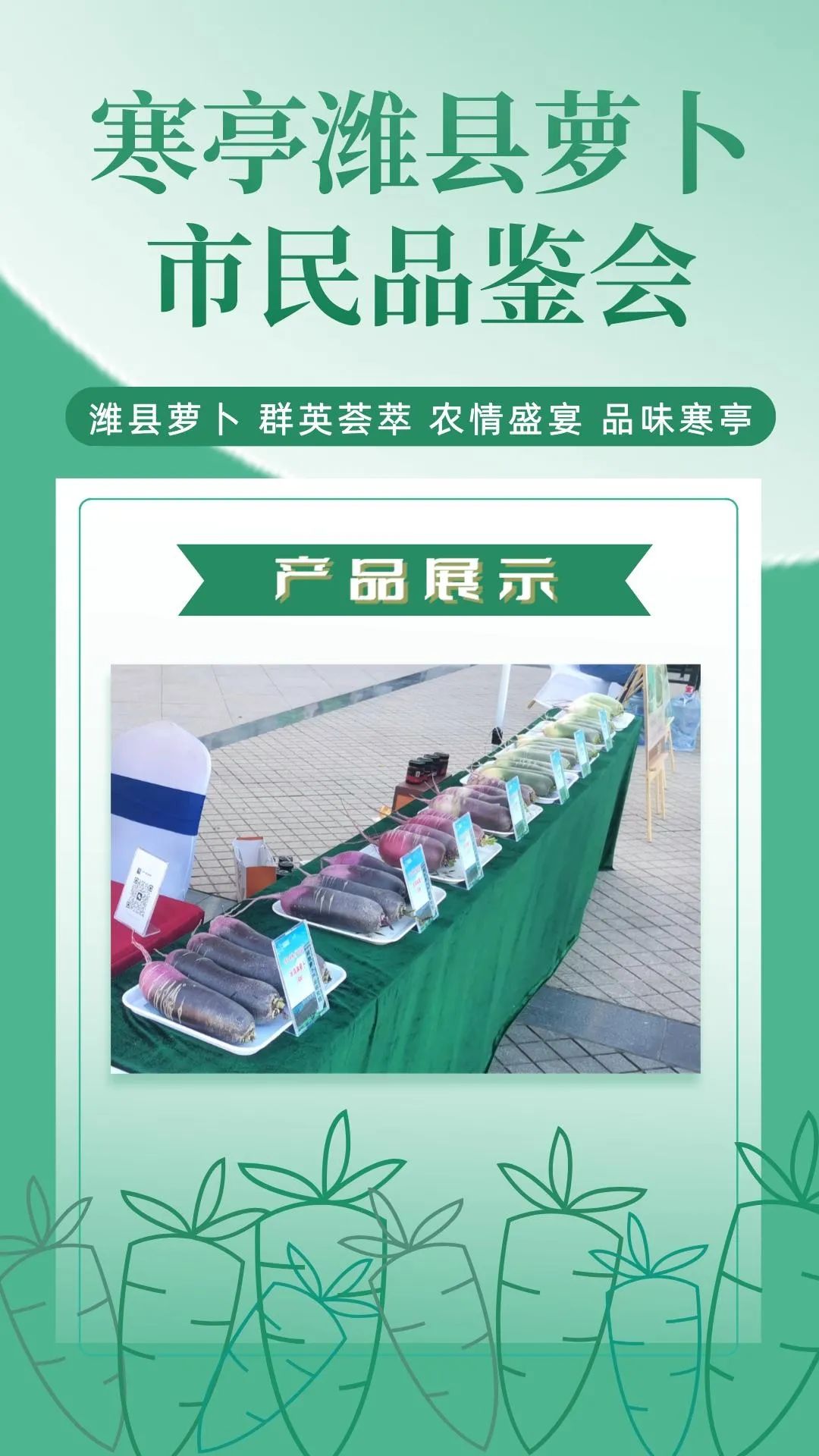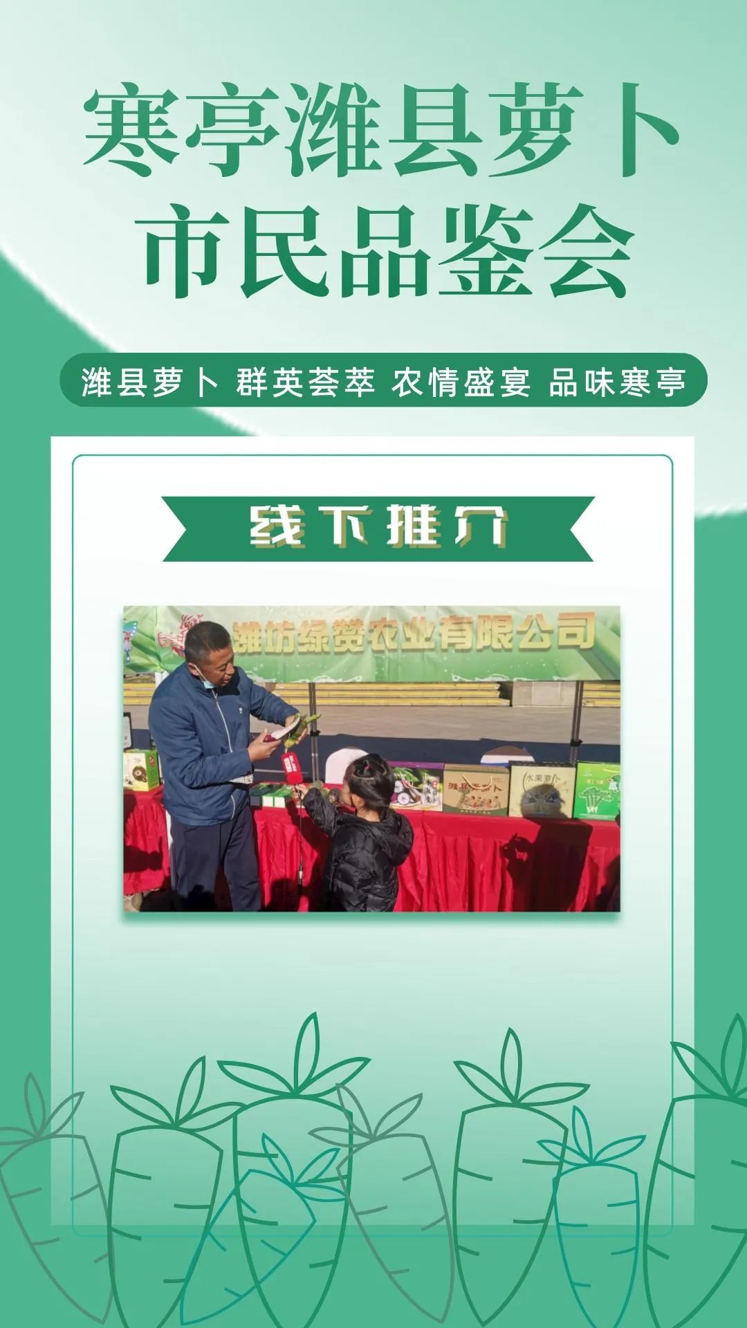 群英荟萃萝卜开会今日上午潍县萝卜市民品鉴会在潍坊市人民广场如期举行来自潍坊市寒亭区的37家萝卜种植企业将自己的特色农品摆上展位通过宣传推介走向大众视野现场人头攒动、热闹非凡!话不多说,直接上图,一起云品鉴!