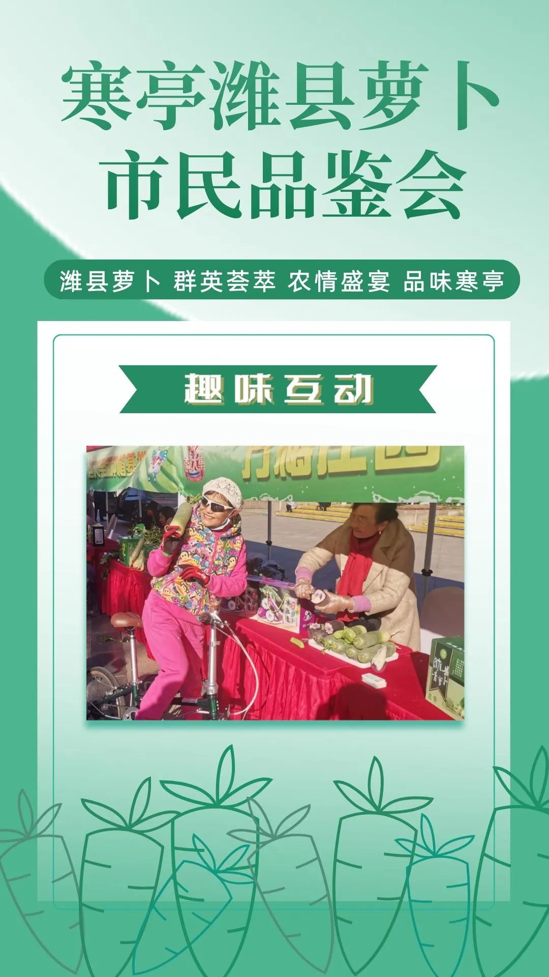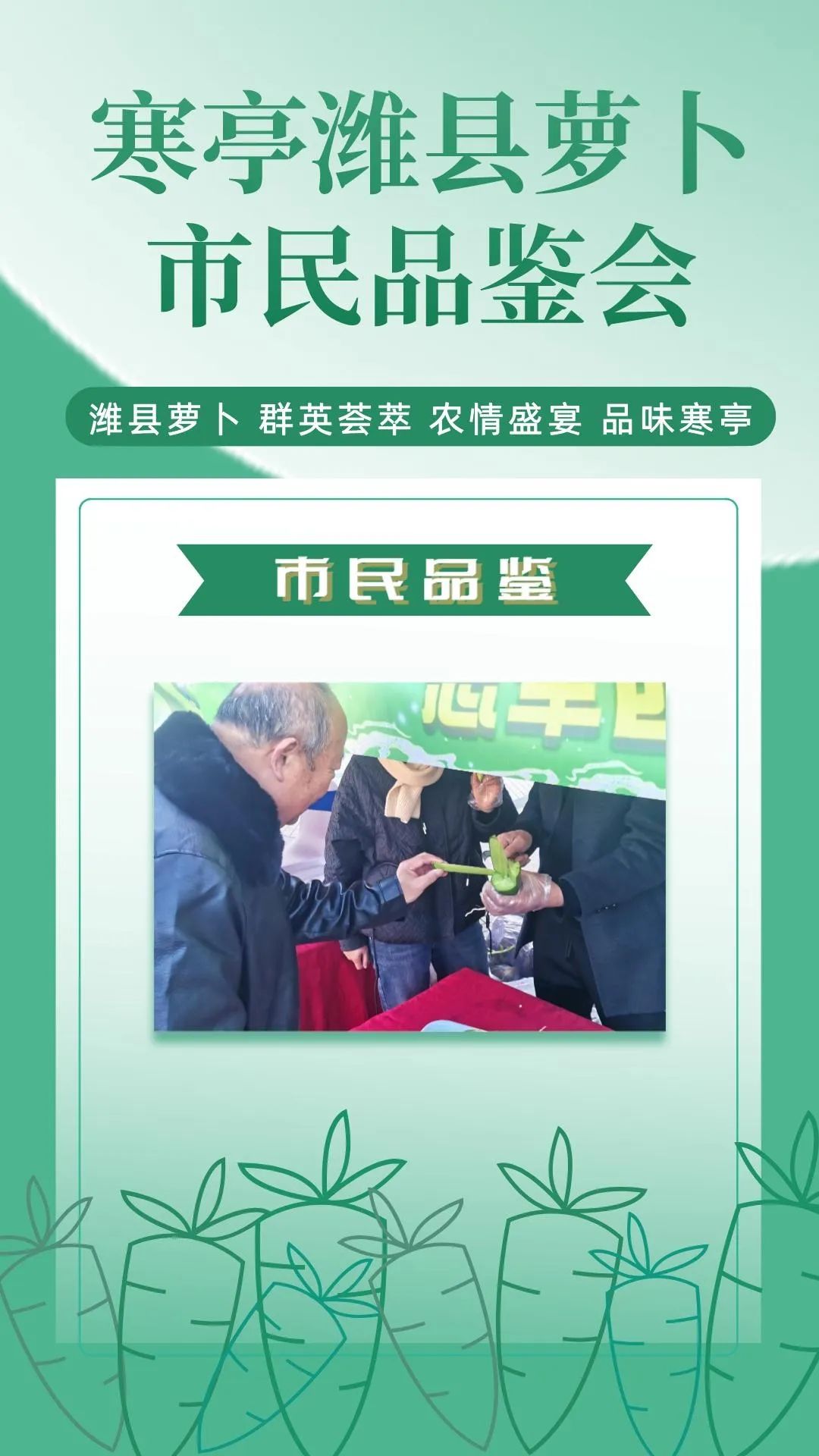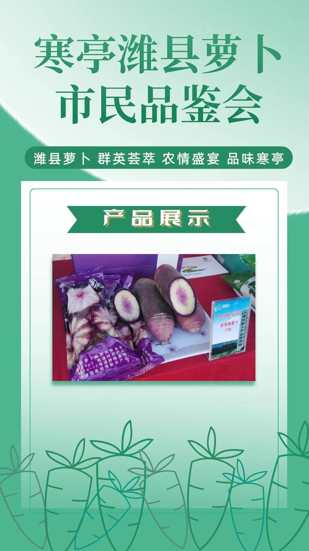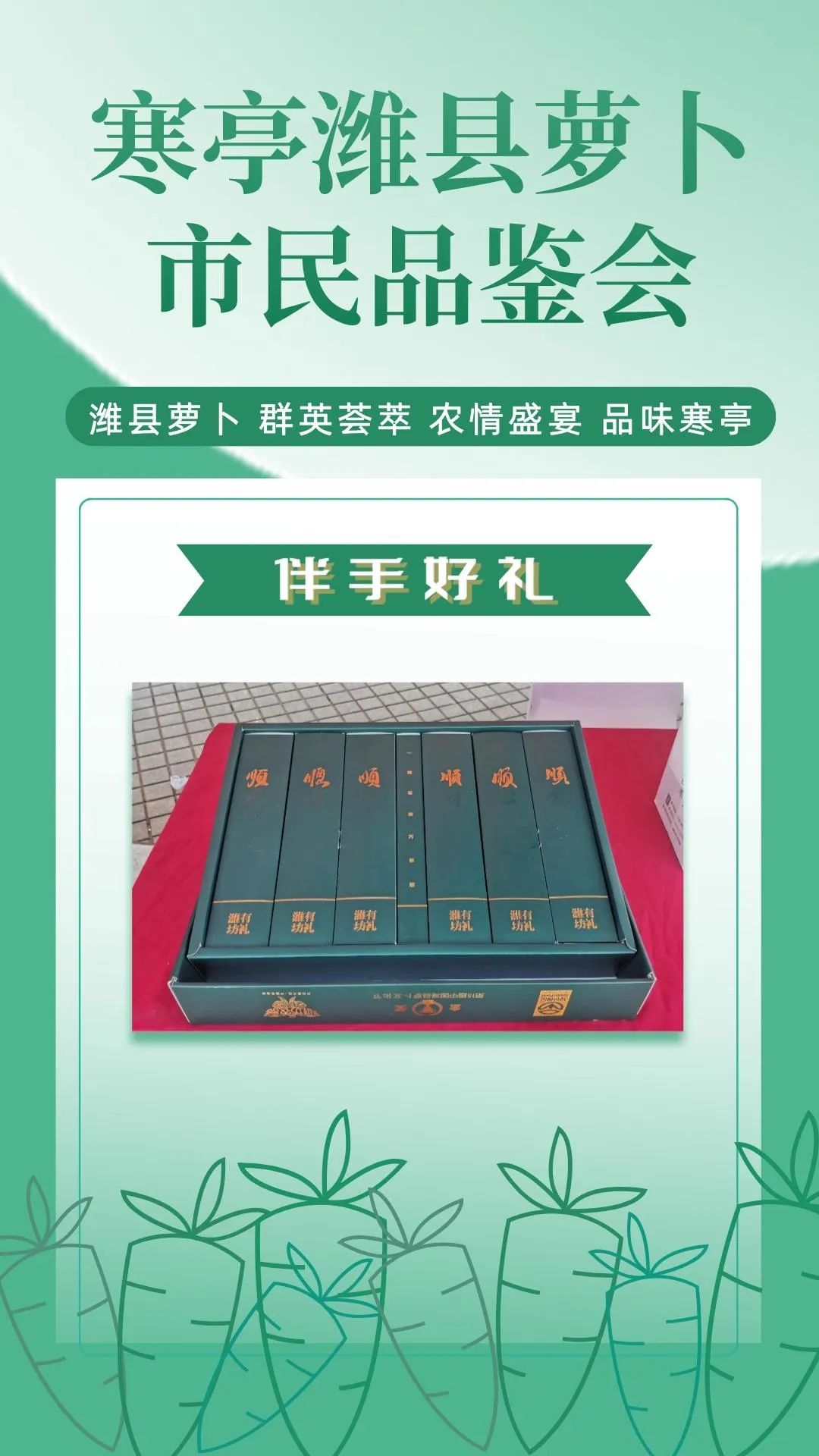 群英荟萃萝卜开会今日上午潍县萝卜市民品鉴会在潍坊市人民广场如期举行来自潍坊市寒亭区的37家萝卜种植企业将自己的特色农品摆上展位通过宣传推介走向大众视野现场人头攒动、热闹非凡!话不多说,直接上图,一起云品鉴!