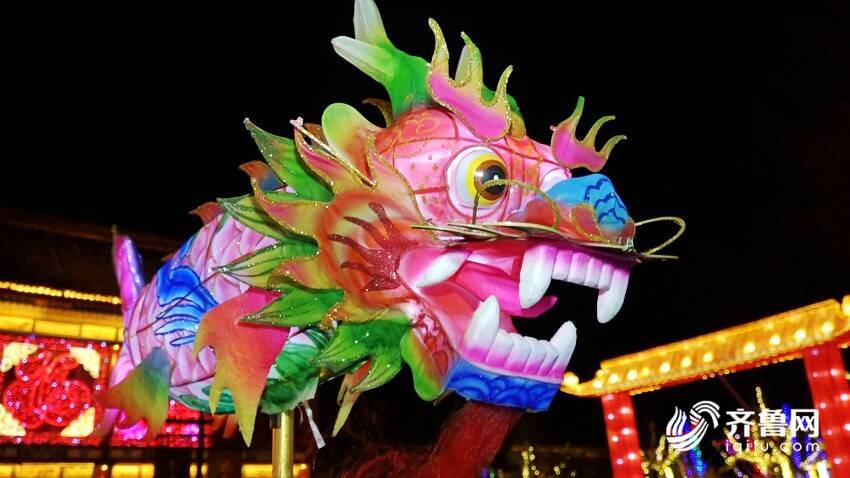 今年,潍坊杨家埠民间艺术大观园以文润阁为主体打造了3D主题灯光秀。五彩缤纷的灯光映射在楼体之上,飞龙、门神等动画依次呈现,场面十分震撼。此外,各式各样的“龙元素”花灯也增添了浓郁的节日氛围。金龙送福、龙行龘龘等主题花灯将园区装扮得格外美丽。