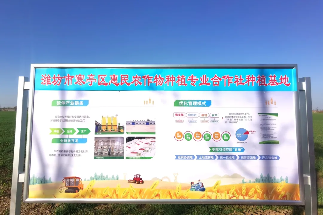 潍坊市寒亭区惠民农作物种植专业合作社位于高里街道一空桥村,由村党支部领办成立,合作社采用现金和土地两种入股形式,按照“保底收入+分红”相结合的分配方式,保障入股村民收益,先后被评为“山东省农民专业合作社示范社”“潍坊市十佳农民合作社”。