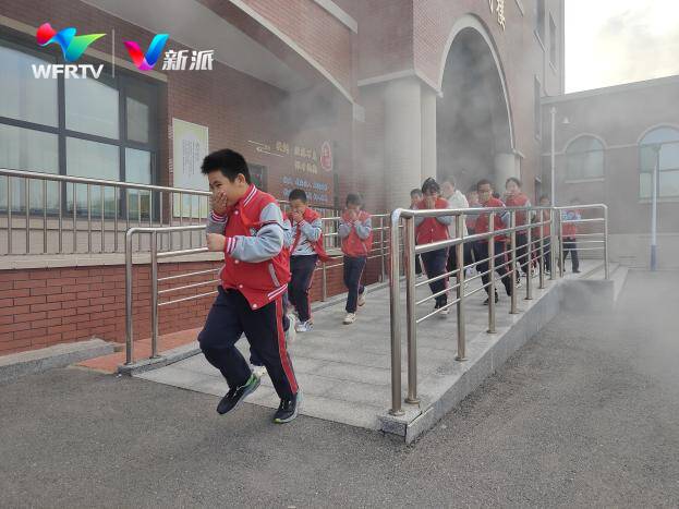 坊子区理想小学的学生们在听到消防应急演练的警铃声后,都手捂口鼻,有序离开教室。