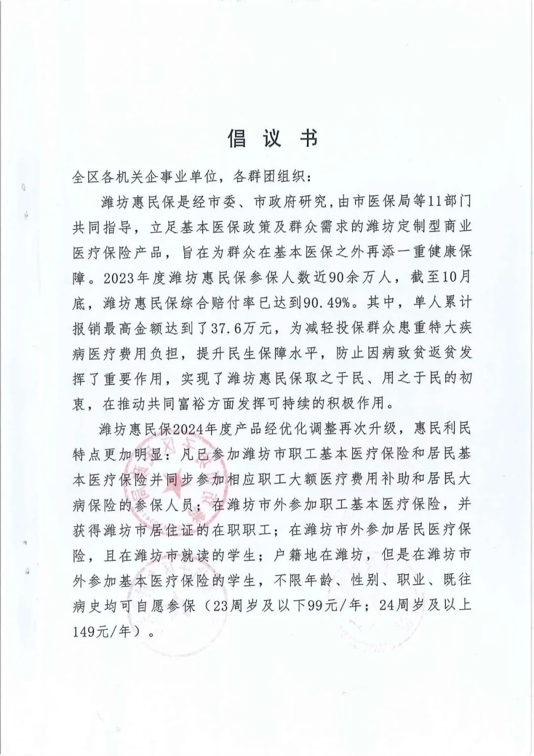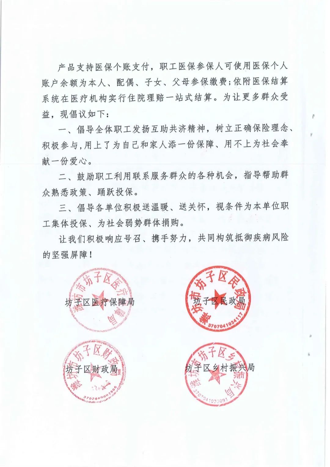 12月5日,坊子区医保局会同民政局等10部门联合发布潍坊惠民保参保倡议书,希望全区企事业单位积极响应号召、携手努力,共同构筑抵御疾病风险的坚强屏障。