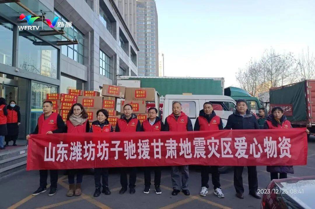 2023年12月25日清晨,满载救灾物资的卡车从坊子出发送至集结地,一同送往甘肃地震灾区,千里驰援灾区群众。