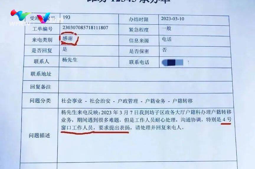2023年3月7日,坊子公安分局接到了一封特殊的表扬信。杨先生专门致电“12345”热线,对分局出入境户政管理科4号窗口的工作人员顺利帮孩子完成户口迁入一事表示感谢,并对工作人员陈辉提出表扬!