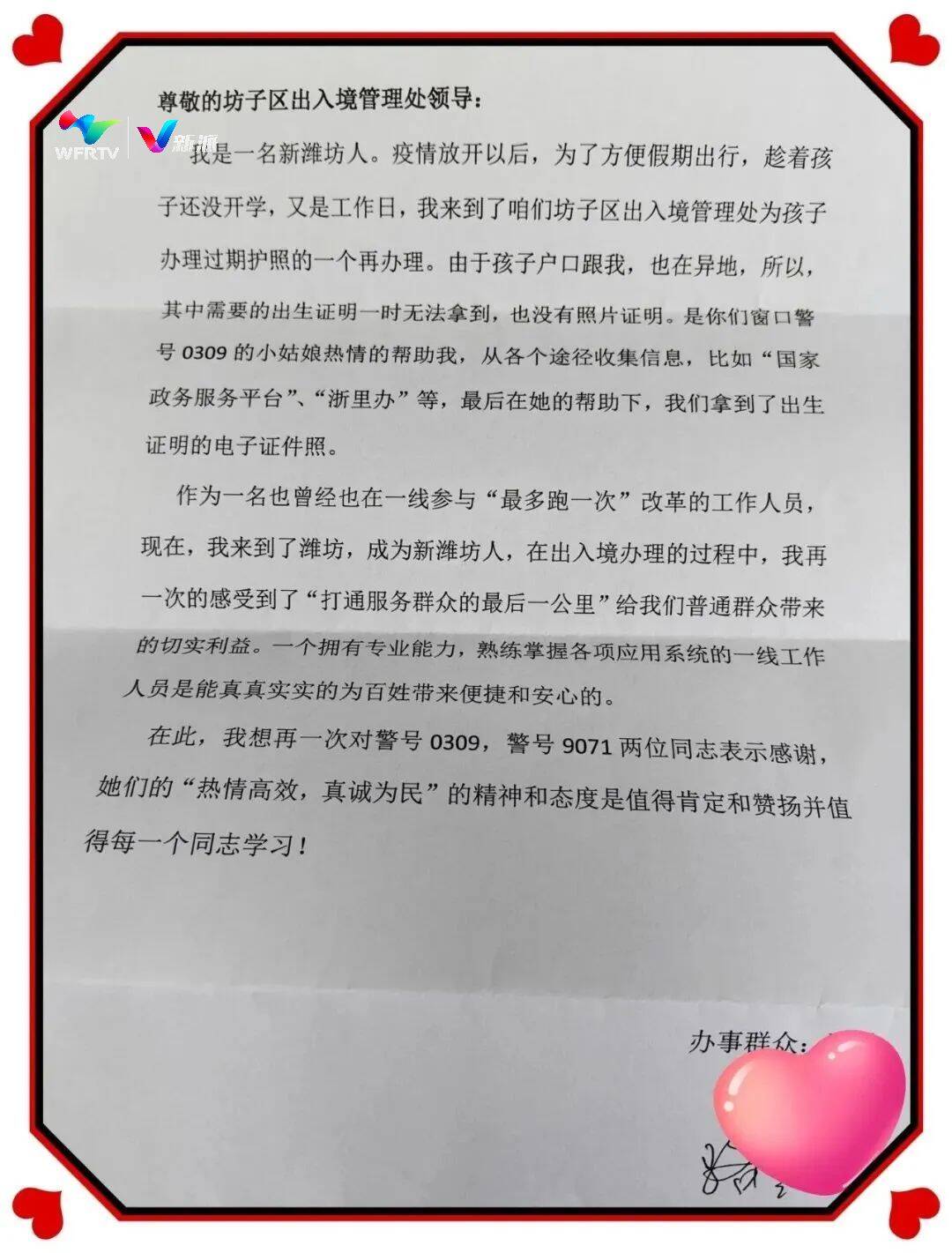 2023年10月,坊子政务服务中心的坊子公安出入境窗口收到了一封来自浙江的“新潍坊人”骆女士的感谢信,感谢工作人员顺利为自己和孩子办理了护照和港澳通行证业务。