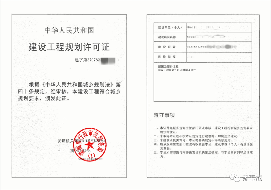 潍坊广电新媒体讯 2023年12月4日,诸城市行政审批服务局向国网山东省电力公司潍坊供电公司发出了建设工程规划许可电子证。
