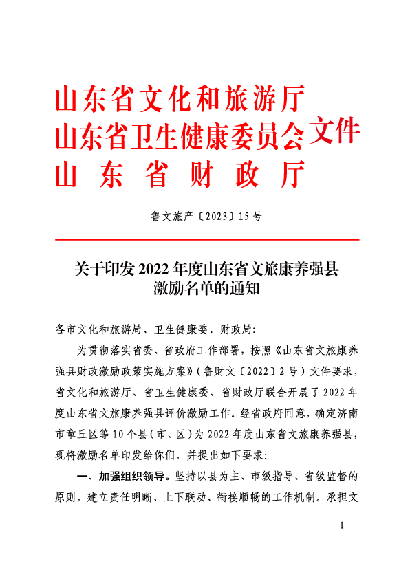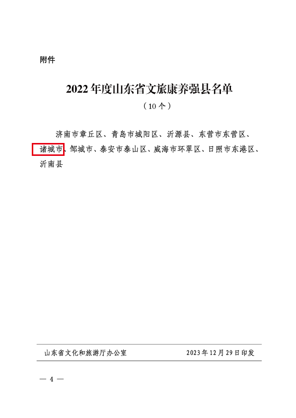 近日,山东省文化和旅游厅、山东省卫生健康委员会、山东省财政厅发布《关于印发2022年度山东省文旅康养强县激励名单的通知》,确定了10个县为文旅康养强县,诸城市榜上有名。