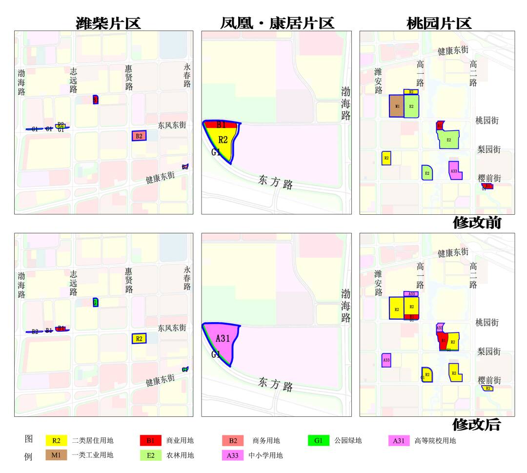 1.潍柴片区:将志远路以西地块修改为商业用地、商务用地,将惠贤路以东地块修改为二类居住用地,将志远路以东地块、永春路以西地块修改为公园绿地。
