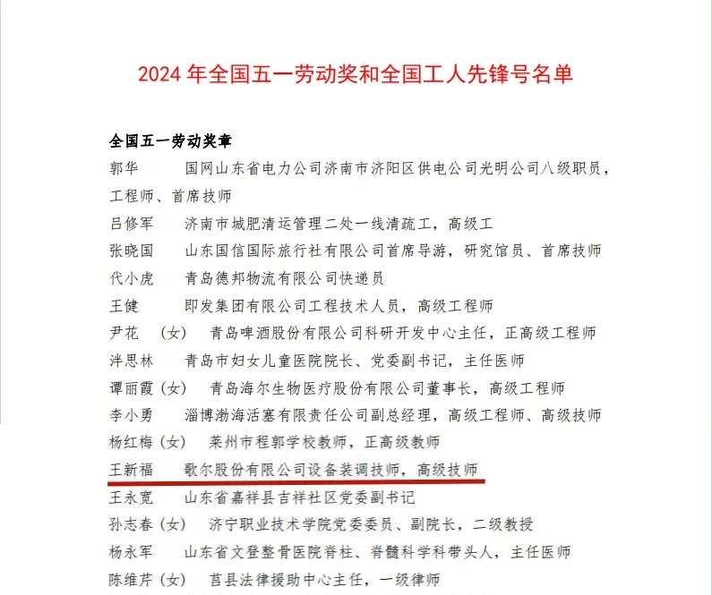 伟大出自平凡,平凡造就伟大。在五一国际劳动节到来之际,全国总工会发布《中华全国总工会关于表彰2024年全国五一劳动奖和全国工人先锋号的决定》。我区歌尔股份有限公司设备装调技师、高级技师王新福获全国五一劳动奖章称号,潍柴动力股份有限公司潍柴青年科技创新团队、山东赛马力发电设备有限公司研发中心获全国工人先锋号称号。