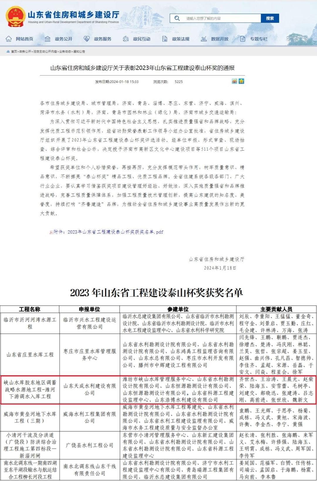 潍坊广电新媒体讯 近日,山东省住房和城乡建设厅公布了山东省工程建设“泰山杯”奖表彰名单,由山东天成水利建设有限公司承建的峡山水库胶东地区调蓄战略水源地工程-潍河下游调水入库工程成功入选,并获水利工程类第三名。