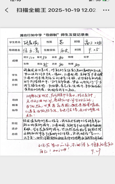 按照学校和教学部统一安排,通过学生自主选择和班主任协调,为每位学生确定指导老师。青年教师积极与学生沟通交流,帮助高一新生调节紧张情绪,缓解高二、高三学生的学习压力,引导学生明确目标、树立信心,充分发挥任课教师在全员育人、全方位育人中的积极作用。