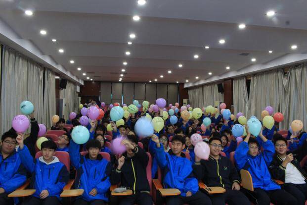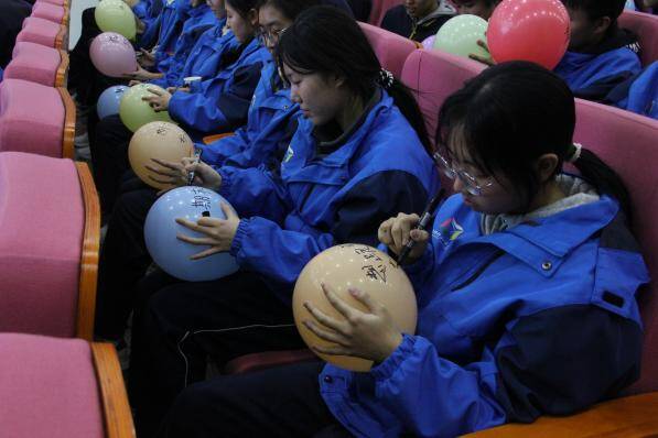 “我的压力气球”暖场活动,像是一场温柔的告别仪式。同学们将心底的焦虑、迷茫与烦恼,轻轻吹进气球,写下那些让自己辗转反侧的心事。当气球破裂的瞬间,不仅是压力的释放,更是与自己的和解。
