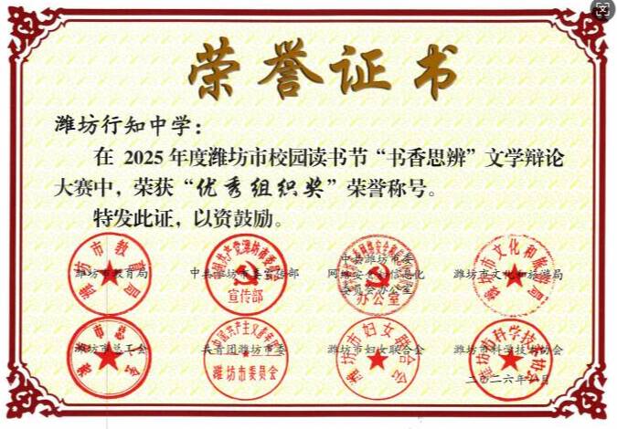 本次校园读书节由潍坊市教育局、市委宣传部等8部门联合主办,吸引了全市数万名师生参与。潍坊行知中学师生在激烈竞争中脱颖而出,荣获“书香思辨”文学辩论赛优秀组织单位。此项荣誉是学校长期深耕书香校园建设的必然结果,既是对学校师生阅读素养与综合能力的肯定,也是践行“管理育人、服务育人、环境育人”理念的有力彰显。未来,潍坊行知中学将继续以以“知行合一”为引领,以书为媒,厚植校园书香底蕴,推动阅读活动常态化、特色化发展,让书香浸润校园,让阅读点亮每一位行知学子的成长之路!