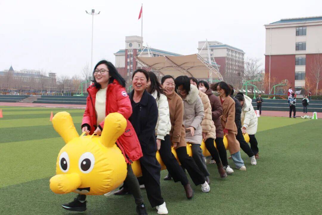 “疯狂毛毛虫”考验默契与协作,“趣味袋鼠跳”欢乐无限。教师们放下粉笔,走出教室,在绿茵场上尽情释放活力,用笑声开启节日的序曲。