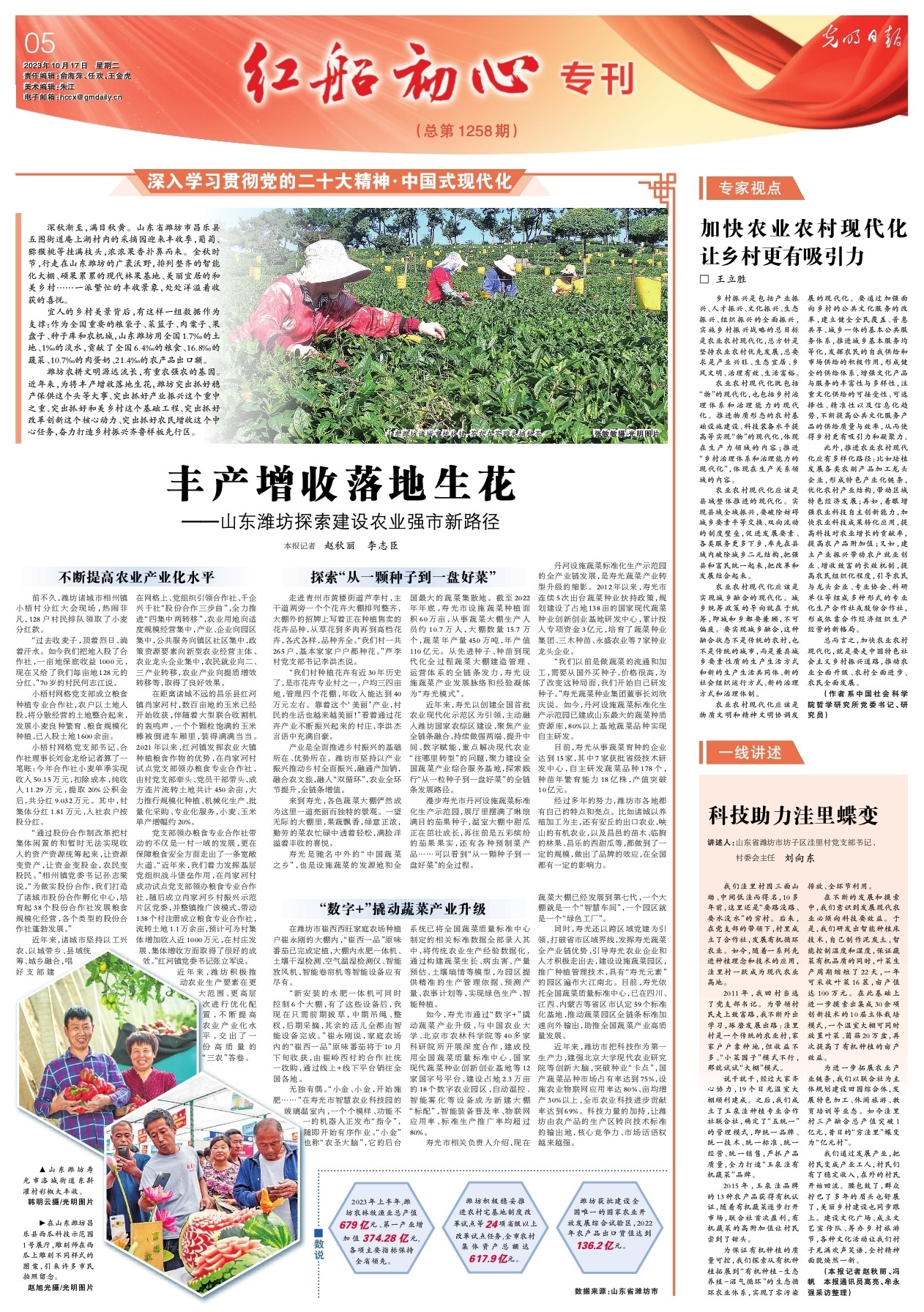 产业是全面推进乡村振兴的基础所在、优势所在。潍坊市坚持以产业振兴推动乡村全面振兴,融通产加销,融合农文旅,融入“双循环”,农业全环节提升,全链条增值。