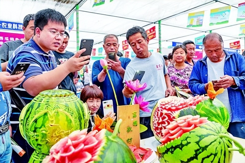 在山东潍坊昌乐县西瓜科技示范园1号展厅,雕刻师在西瓜上雕刻不同样式的图案,引来许多市民拍照留念。赵旭光摄/光明图片