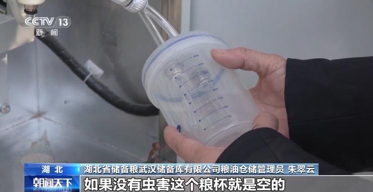 湖北省储备粮武汉储备库有限公司粮油仓储管理员 朱翠云:大概需要60秒时间,如果有虫害的话就会抽到这个粮杯里面,如果没有虫害这个粮杯就是空的。