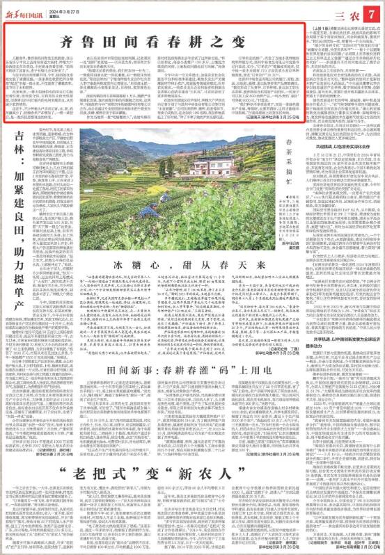 今日出版的《新华每日电讯》在第7版以《齐鲁田间看春耕之变》为题,聚焦山东粮食生产。文章提到,不少种粮大户表示,水、肥、药用量减少了,但粮食单产却增加了。一增一减背后,是一批农民思想观念的转变。