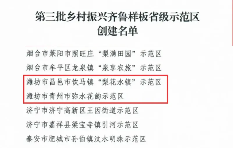 近日,省农业农村厅、省财政厅联合公布了第三批乡村振兴齐鲁样板省级示范区创建名单,潍坊昌邑饮马镇“梨花水镇”示范区、潍坊青州弥水花韵示范区成功入选。