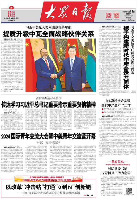 本报济南7月12日讯根据国家统计局今天公布的2024年夏粮产量数据,山东夏粮生产实现面积、单产、总产“三增”:全省夏粮播种面积6036.3万亩,同比增加21.45万亩、增长0.4%;亩产450.03公斤,同比增加5.44公斤/亩、增长1.2%;总产543.3亿斤,同比增加8.48亿斤、增长1.6%。
