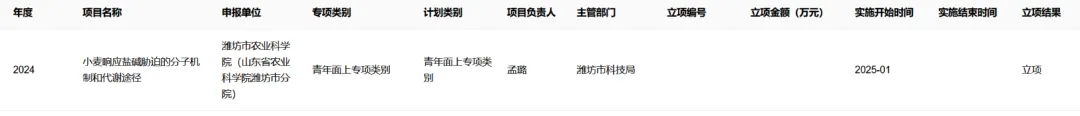 9月18日,山东省科学技术厅公布了2024年度山东省自然科学基金项目拟立项项目,我院小麦所孟璐申报的“小麦响应盐碱胁迫的分子机制和代谢途径”项目获批自然科学青年基金项目。