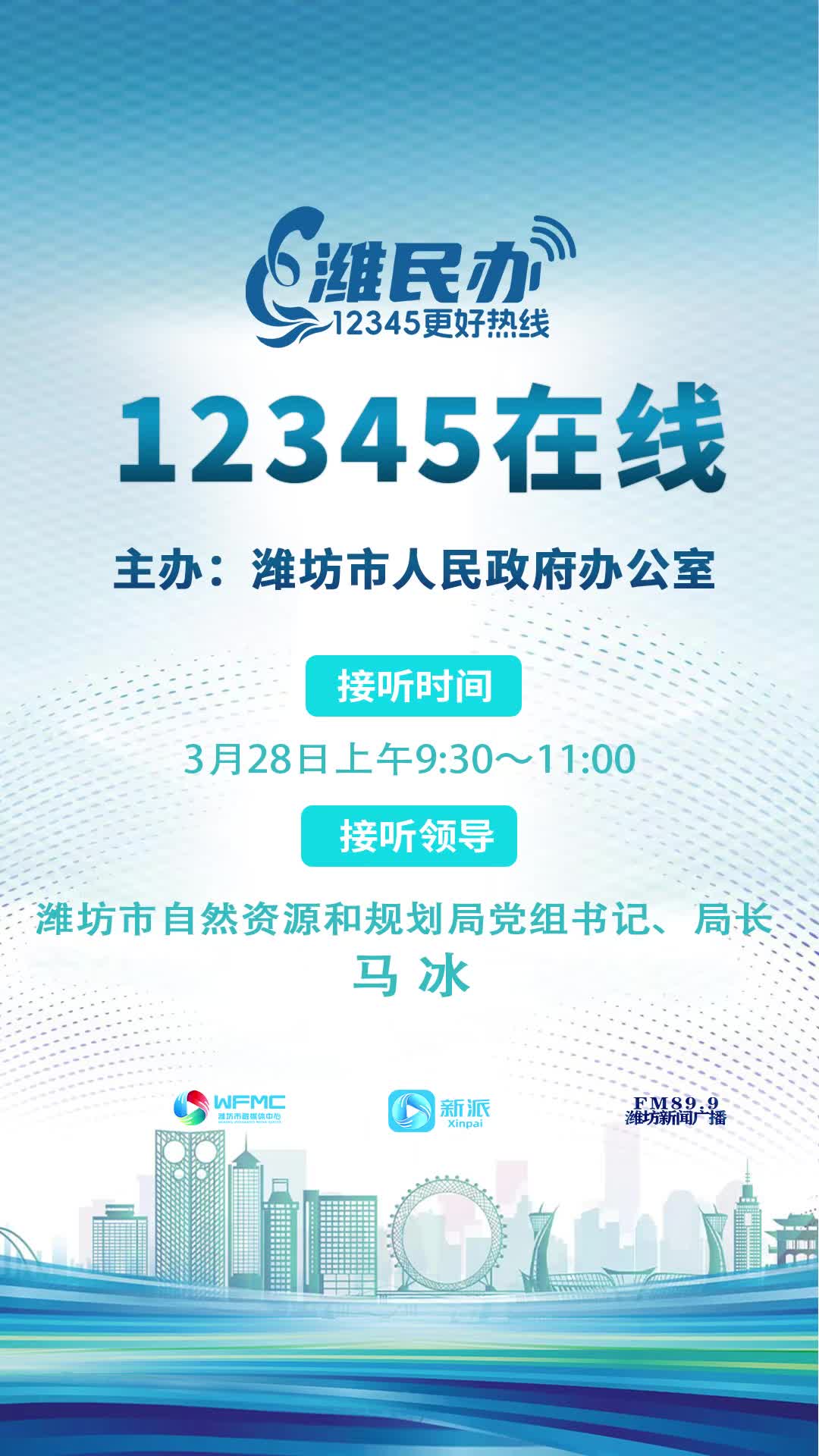 3月28日上午9:30~11:00,潍坊市自然资源和规划局党组书记、局长马冰将走进市融媒体中心新闻频率《12345在线》直播间接听热线。
