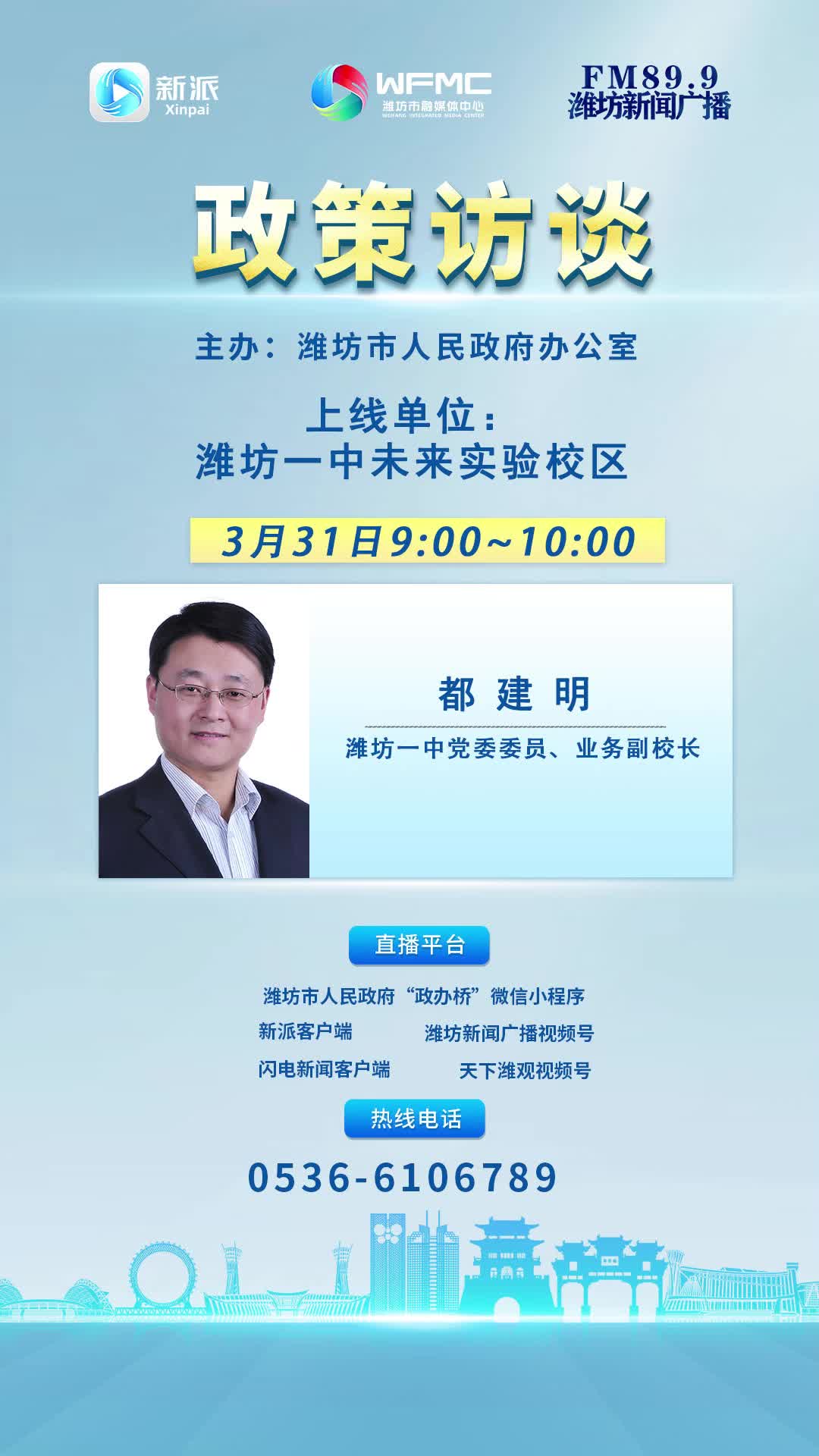 3月31日上午9:00~10:00,潍坊一中党委委员、业务副校长都建明将走进市融媒体中心新闻频率《政策访谈》栏目直播间