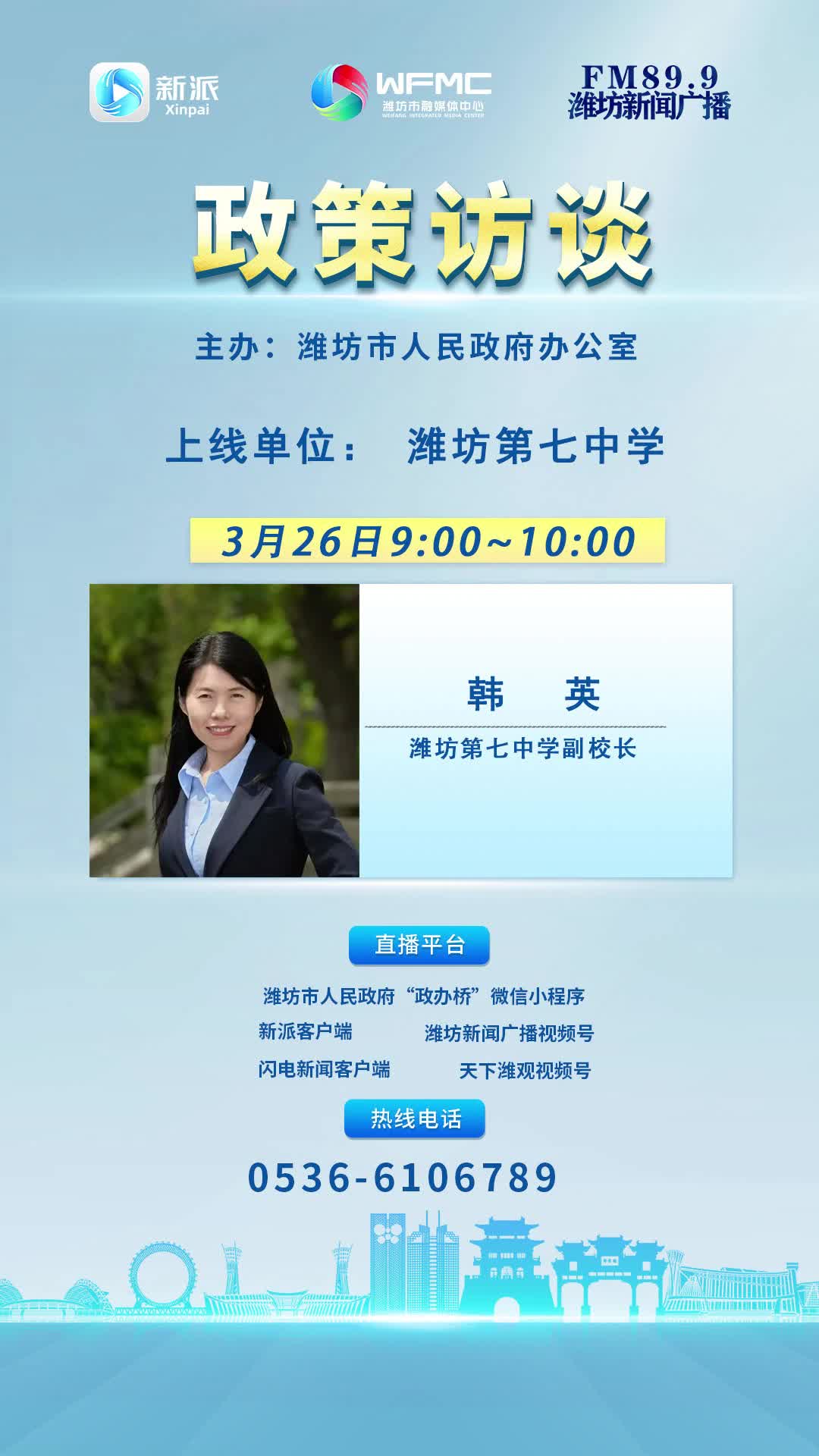 3月26日上午9:00~10:00,潍坊第七中学副校长韩英将走进市融媒体中心新闻频率《政策访谈》栏目直播间,敬请关注!