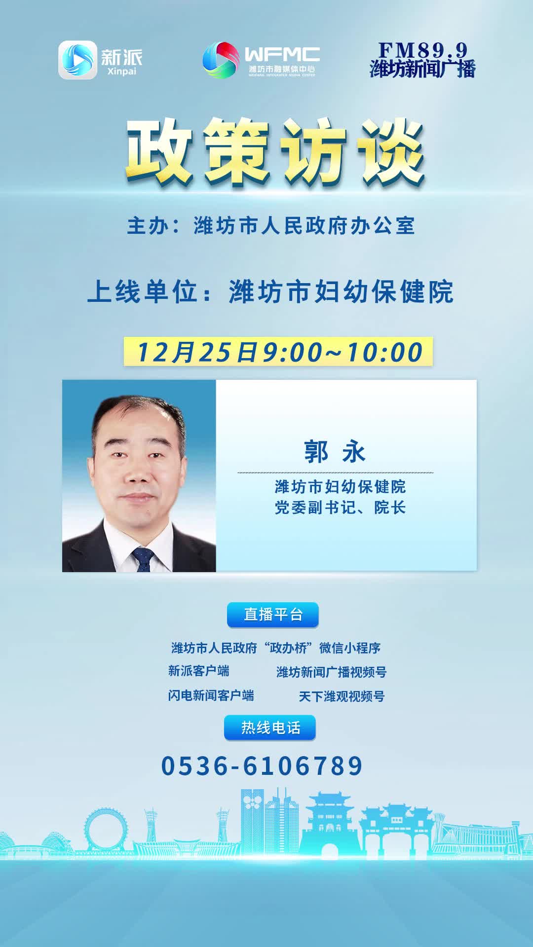 12月25日上午9:00~10:00,潍坊市妇幼保健院党委副书记、院长郭永将走进市融媒体中心新闻频率《政策访谈》栏目直播间,敬请关注!