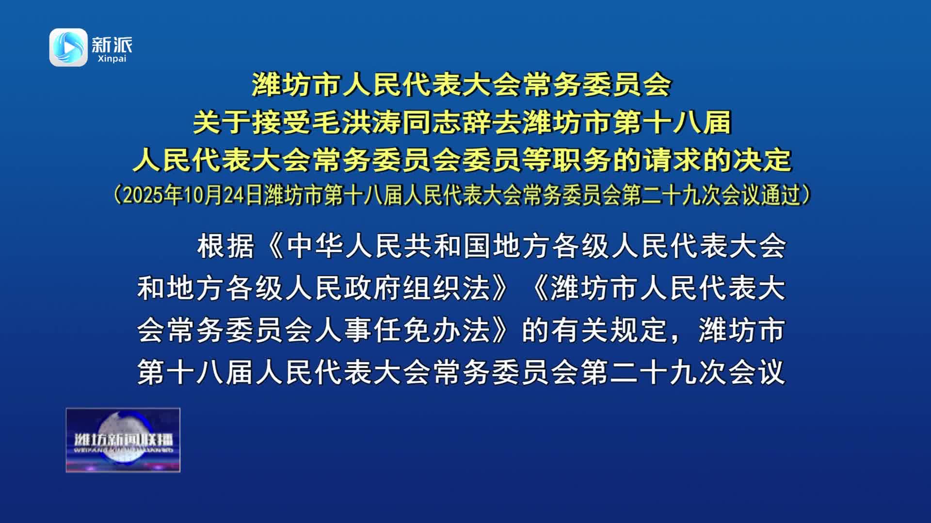 【潍坊新闻联播】潍坊市人民代表大会常务委员会关于接受毛洪涛同志辞去潍坊市第十八届人民代表大会常务委员会委员等职务的请求的决定