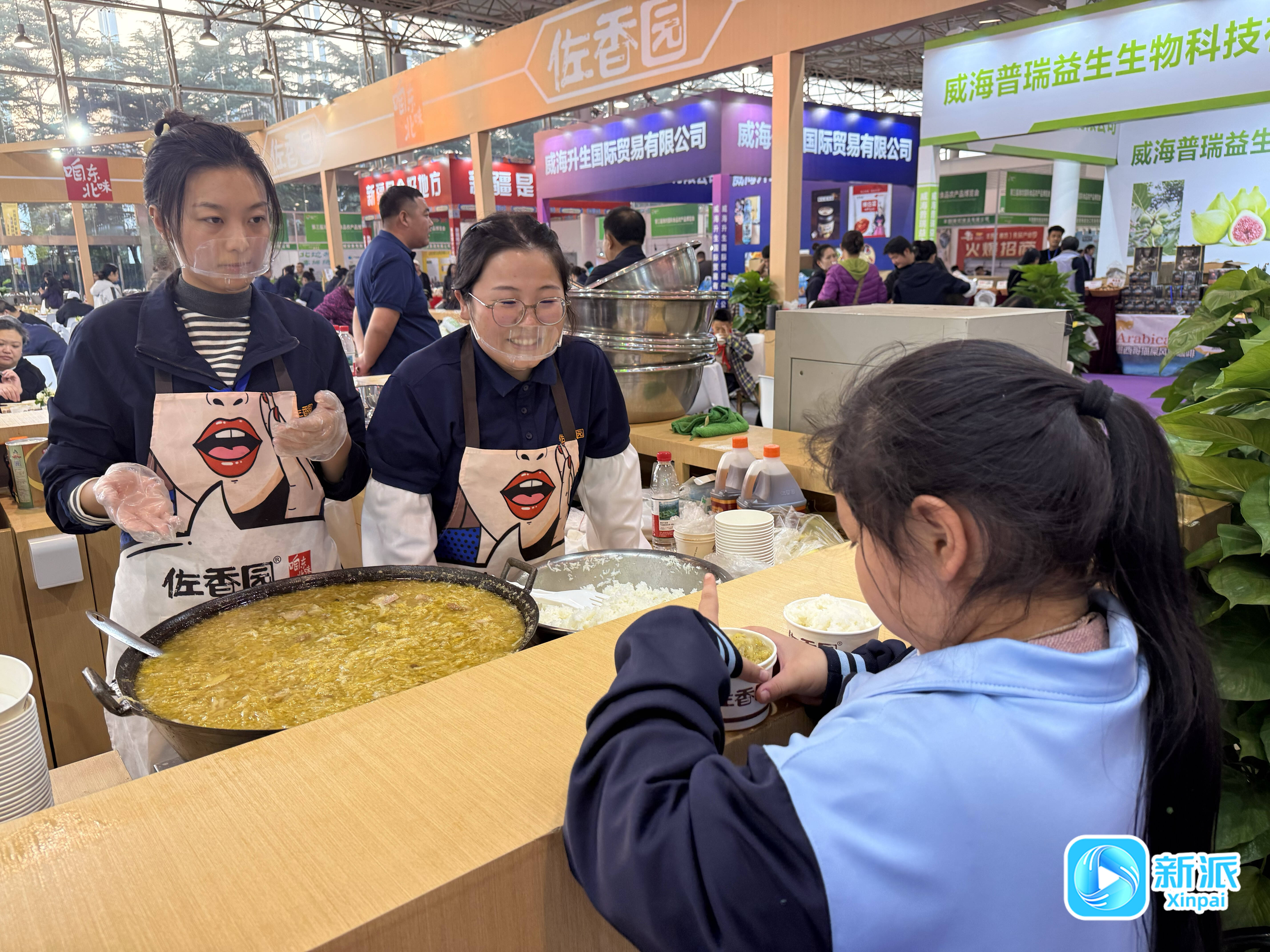 移步至西侧食博会展区,国际范儿与烟火气在此碰撞。东南亚咖啡香气弥漫、俄罗斯巧克力香醇丝滑,新疆葡萄干个大味美、云南菌汤包鲜美非常,各个国家地区、全国各省份的特色产品次第铺陈。来自辽宁葫芦岛的佐香园派出了100名“精兵强将”,现场熬煮了几大锅的酸菜猪肉,配上一碗热腾腾的米饭,谁能拒绝这超大份的“东北热情”?潍坊本地的味道更显亲切,福益合的花饽饽捏成憨态可掬的模样,一咬便是松软的麦香;芥末鸡的独特风味,配上脆甜的潍县萝卜,瞬间征服人们的味蕾。