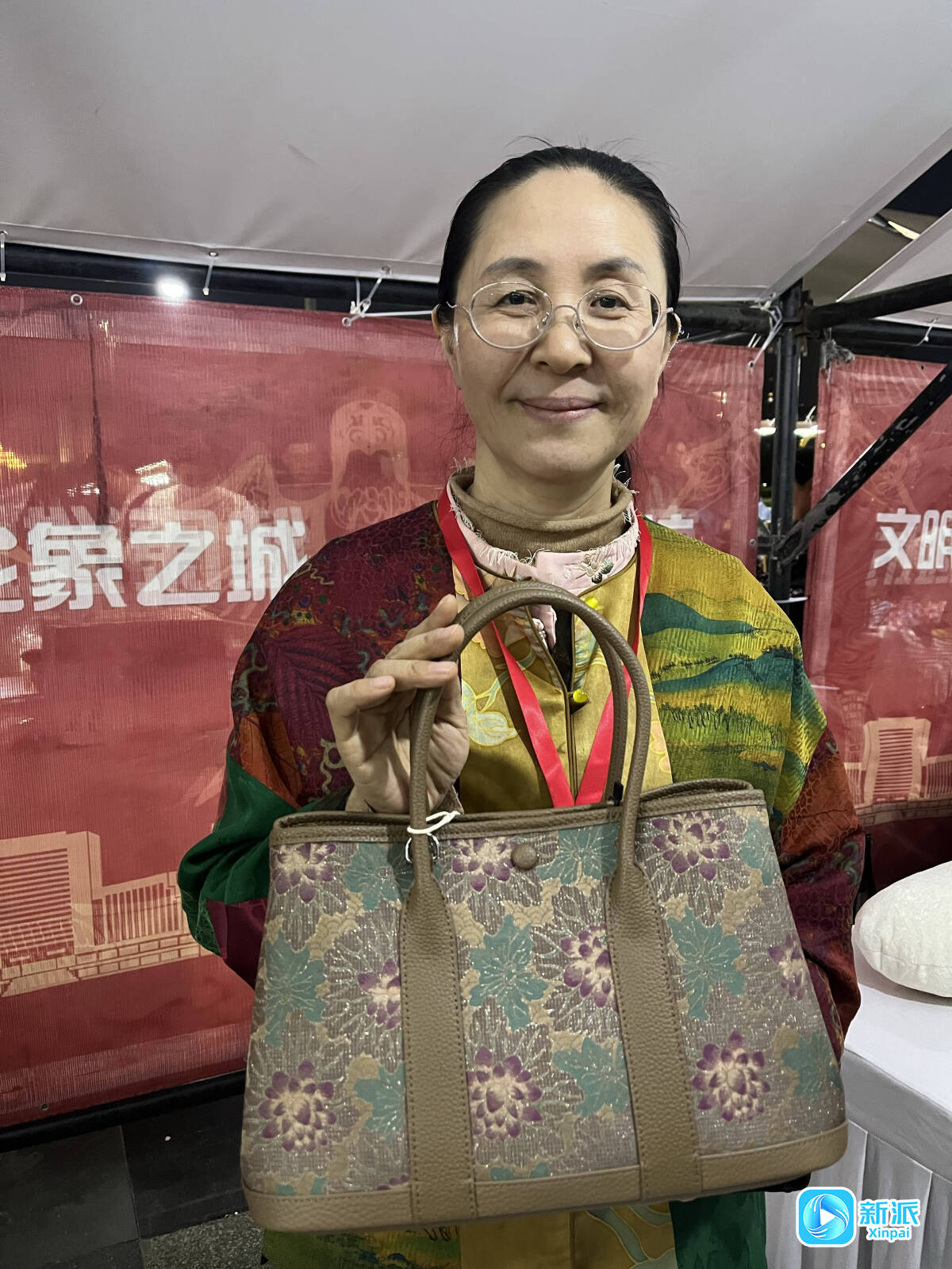 马玉芳展示香云纱手工包。