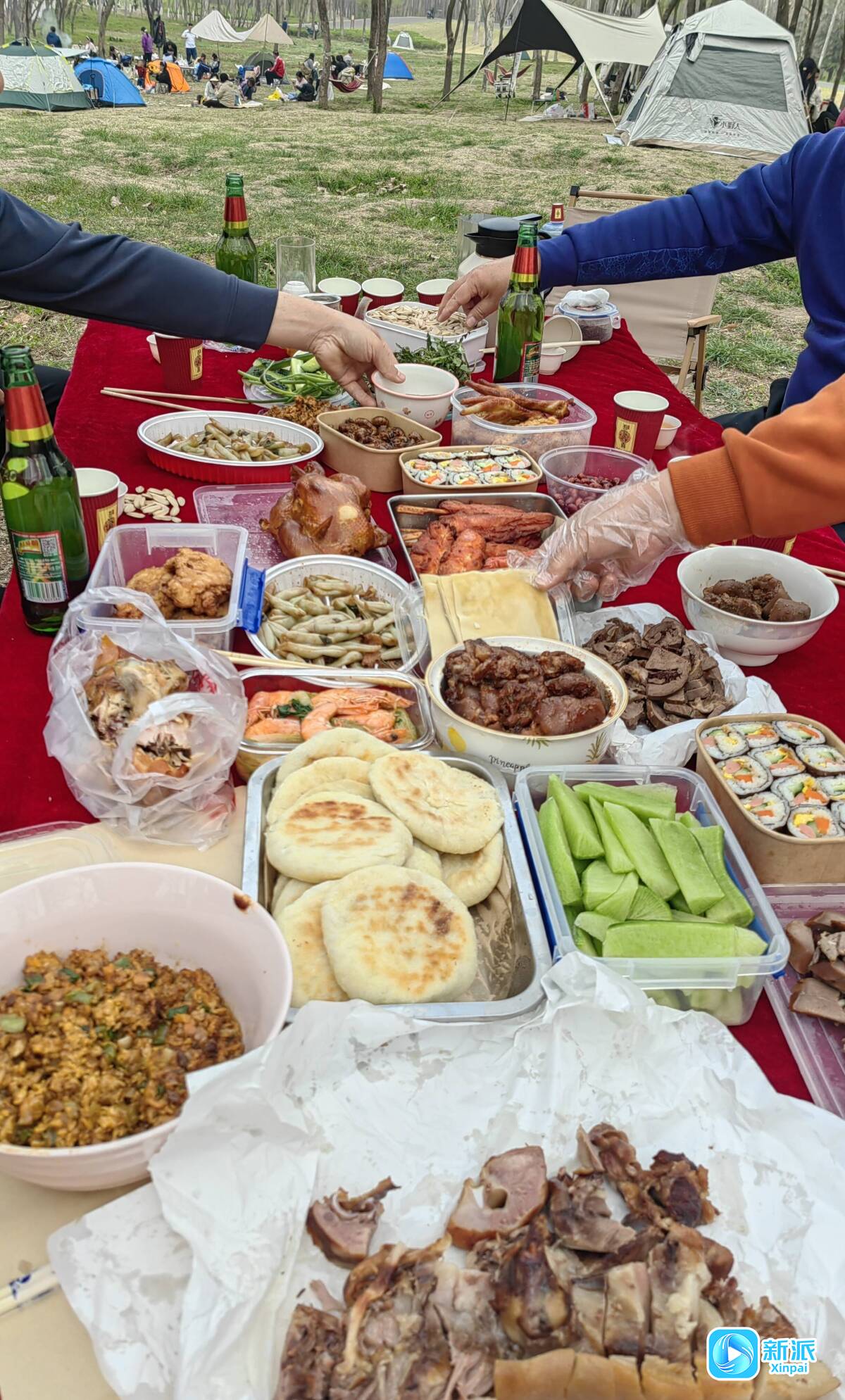奎文区虞河生活城小区居民刘女士一家的野餐食物十分丰盛,有刚出锅的烤猪蹄、煎鲅鱼、盐水大虾及寿司、肉火烧等美食。“周末休息,我们兄弟姊妹带上孩子一起来公园露营、野餐,放松身心,感觉棒极了。”刘女士说,他们兄弟姊妹3人都住在城区,每到周末都会聚会,眼下春暖花开,在公园内野餐是一个不错的选择,他们有的准备露营装备,有的准备食物,提前做好了充分准备。当天,他们还带来了热水、茶叶,饭后可以喝喝茶、聊聊天,十分惬意。