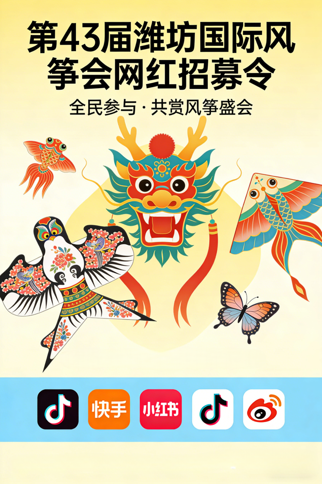 今年,我们不只要放飞风筝,更要让这场盛事被更多人看见。现诚邀一群有态度、有温度、有流量的网络达人,与我们一同记录风筝的万千姿态,讲述潍坊的动人故事。