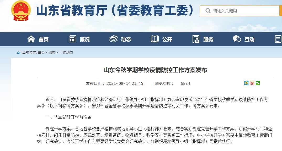 记者从山东省教育厅获悉,近日,山东省委统筹疫情防控和经济运行工作领导小组(指挥部)办公室印发《2021年全省学校秋季学期疫情防控工作方案》,安排部署全省学校秋季学期开学疫情防控等相关工作。山东各地相继安排部署秋季开学时间安排以及开学疫情防控等相关工作。闪电新闻记者一一进行了整理。