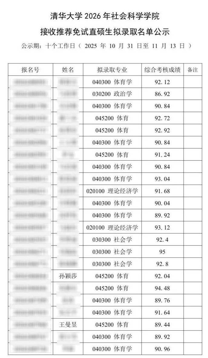 记者从清华大学获悉,该校社会科学学院10月30日发布2026年接收推荐免试直硕生拟录取名单公示。其中,乒乓球运动员孙颖莎和王曼昱进入拟录取名单。