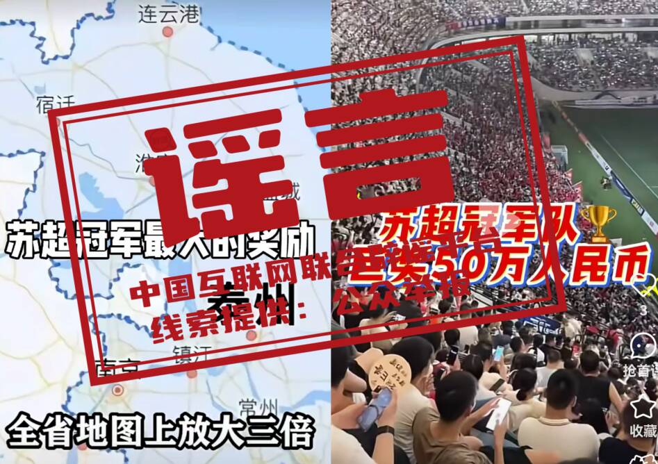 辟谣:地图放大三个字号?奖金五十万?这些网传苏超冠军队奖励都是假的!
