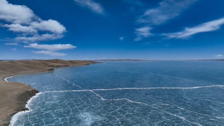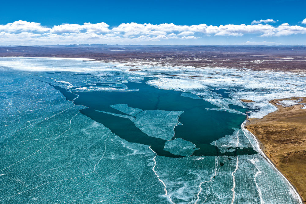 3月10日在青海省果洛藏族自治州玛多县境内拍摄的扎陵湖一角。初春时节,黄河源地区冰雪渐融。新华每日电讯记者 张龙 摄