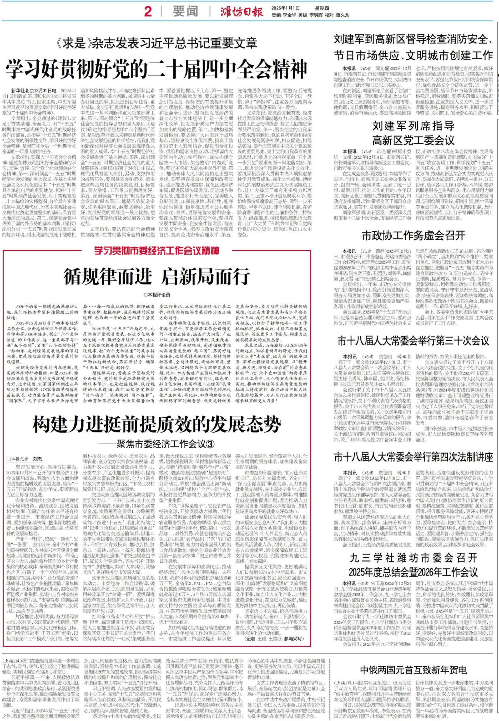 2026年是“十五五”开局之年,也是潍坊扩量提质发展、奋进万亿城市的关键一年。做好全年经济工作,核心在于深刻把握并自觉运用经济发展客观规律,把“六个更加注重”的要求转化为推动发展的具体实践,以新年新干劲扛起新使命、落实新任务,确保“十五五”开好局、起好步。