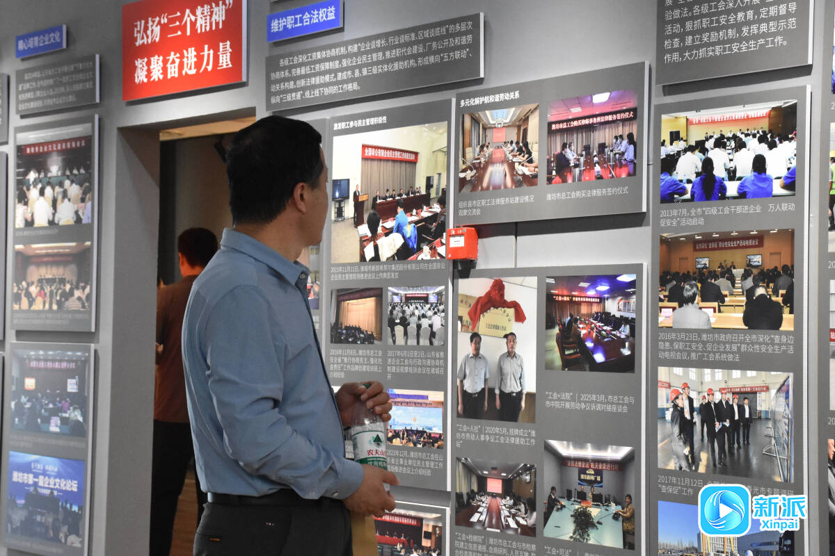 除主线展区外,三个专题展厅更是整场展览的“高光亮点”。“三个精神”展厅里,潍坊历代劳模的照片组成一面璀璨的“星光墙”,旁边的事迹文字,无声诉说着他们不平凡的奋斗历程;“产改”展厅中,一组组清晰的图表,直观呈现出潍坊产业工人队伍建设的改革成果,从技能培训到权益保障,各项成效一目了然、数据翔实;“工会组织沿革”展厅内,清晰标注出潍坊工会的发展轨迹,让人直观感受到“娘家人”一路的成长与担当。整场展览以全景式视角,生动展现了潍坊工人阶级在中国共产党领导下,为民族解放、社会进步与城市发展作出的卓越贡献,构筑起一道亮眼的“精神长廊”。