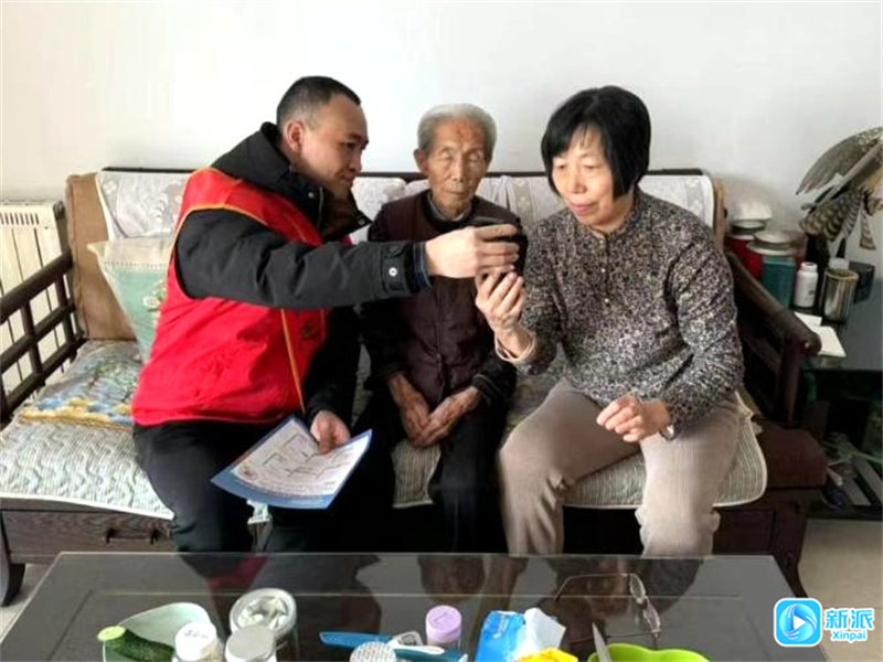 工作人员为行动不便的老年人提供养老保险待遇资格认证上门服务。