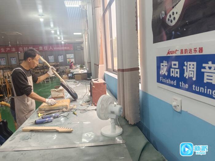 在昌乐昌韵达乐器有限公司,四十多岁的调音师李庆生戴着手套,灵巧的双手一边调旋钮,一边弹弦。他说,自己干过很多工种,现在是调音师,一天能调两三百把电吉他。