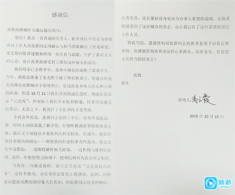 新派讯 “感谢贵局工作人员张群同志用耐心与担当帮我解决了快递难题,他用一份认真与温暖,守护了我对亲人的心意,也让我感受到了潍坊这座城市的温度……”近日,潍城区交通运输局收到了一封情真意切的感谢信。此前辖区一位居民的快递“失联”,内含远方亲人寄来的家乡特产,具有特殊意义,该居民与快递代收点多次沟通无果,情绪激动,潍城区交通运输局快递科工作人员张群了解到这一情况后,第一时间联系当事人、安抚焦虑情绪,直奔涉事代收点核实。